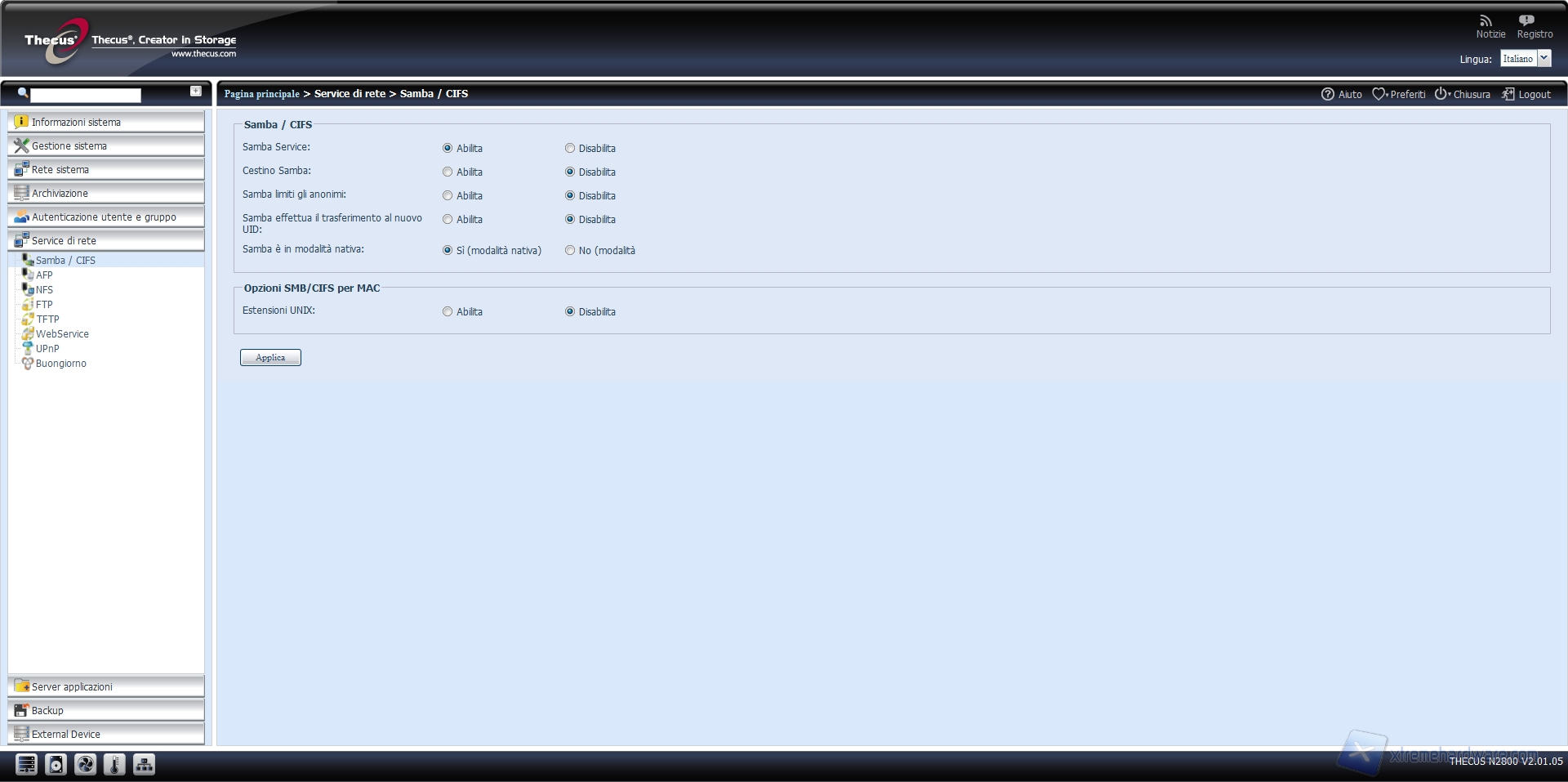 SAMBA/ CIFS, AFP, NFS, FTP, TFTP, WEBSERVICE, UPnP e BUONGIORNO