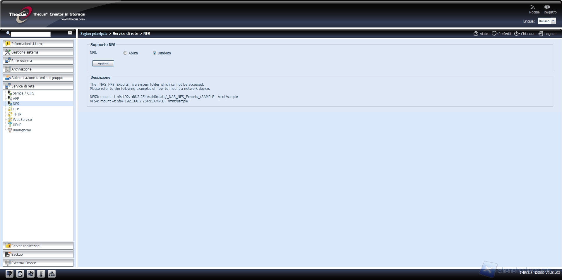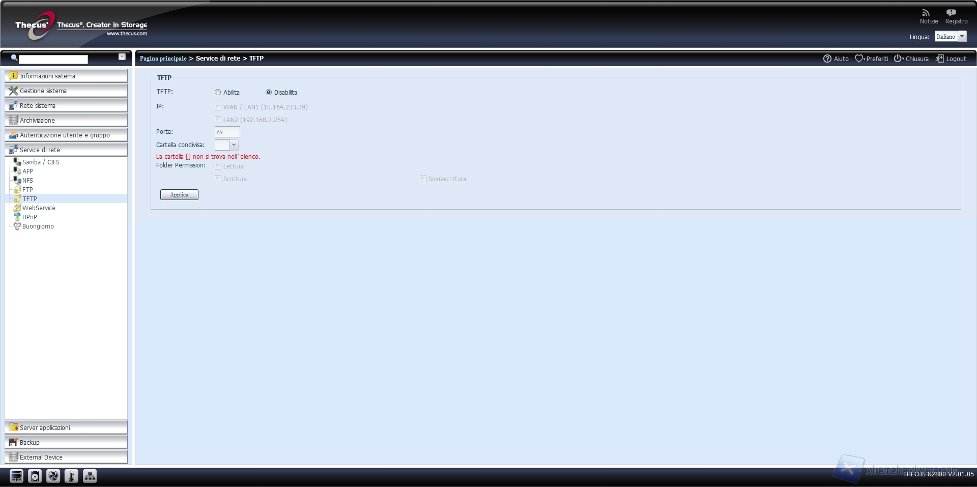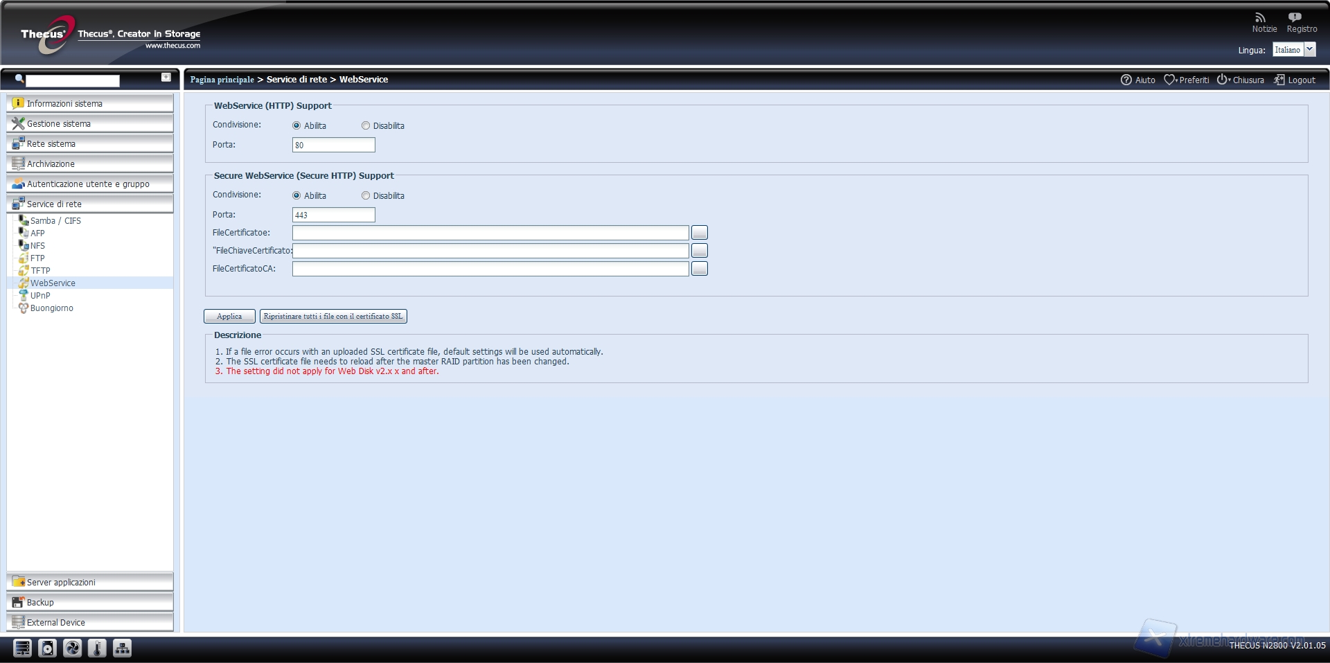 Altro servizio che il Thecus N2800 mette a disposizione è il WebService, che permette la navigazione all’interno del NAS tramite protocollo http o il più sicuro HTTPS.