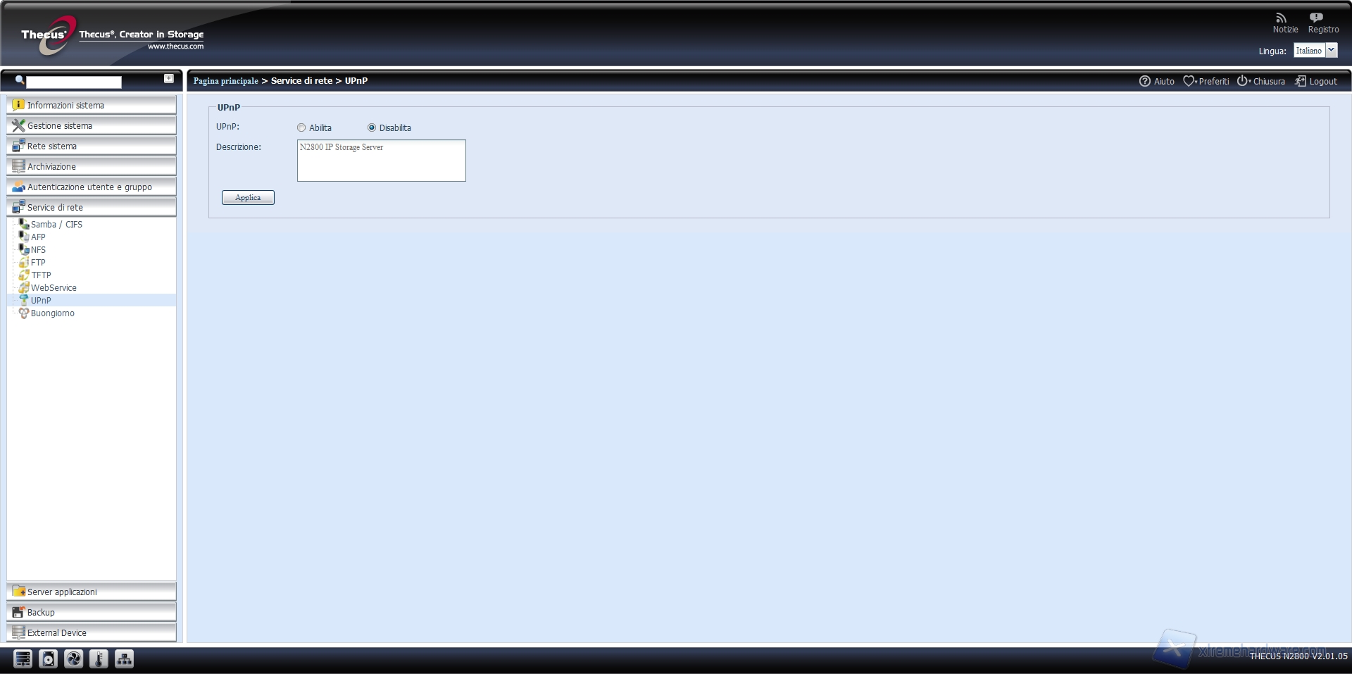 Se vogliamo utilizzare in NAS come postazione multimediale e godere delle funzionalità media center, come ad esempio la riproduzione di filmati in streaming, dovrete abilitare il servizio UPnP.